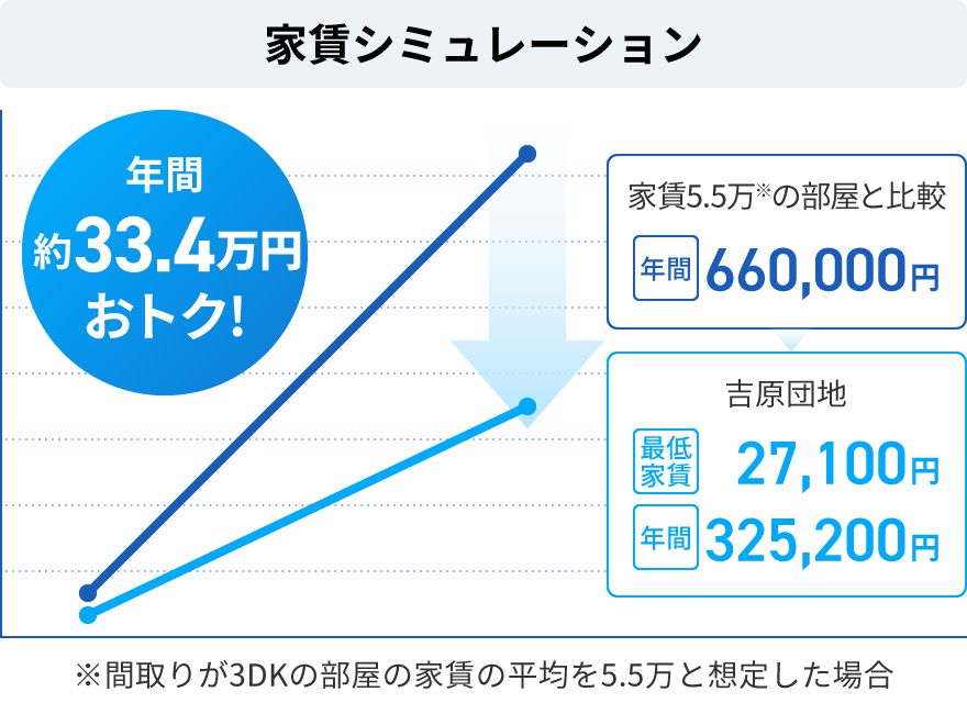 - 一般のアパート・マンションと比べて家賃が安く「礼金」「仲介手数料」「更新料」が無いため、生活費の負担を軽減できる