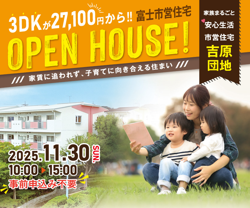 吉原団地は、すべての部屋が3DKで、近隣に保育園、小学校や、スーパー、公園などがあり、子育て世帯など様々な世帯におすすめです。特に家族で暮らす子育て世代におすすめです。内覧会では市営住宅のお部屋を多くの皆様に見ていただきたいと考えておりますので、入居希望者でなくても、お気軽にご来場ください。